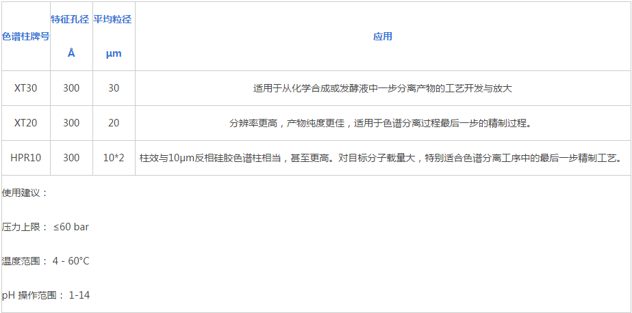 AMBERCHROM™ XT(中、高压色谱)Amberchrom™ XT 色谱填料机械强度更佳,压力上限60bar,适用于中、高压色谱装置。其强大的分辨率率在满足产品质量要求的前提下,进一步提高了产品的收率。